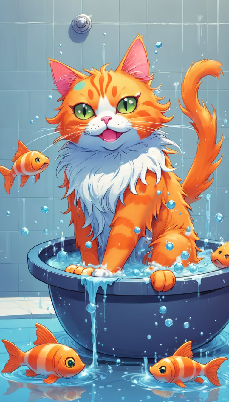 Prompt: A colorful anime cat taking a bath, detailed orange anime cat, water, bath, fish, funny