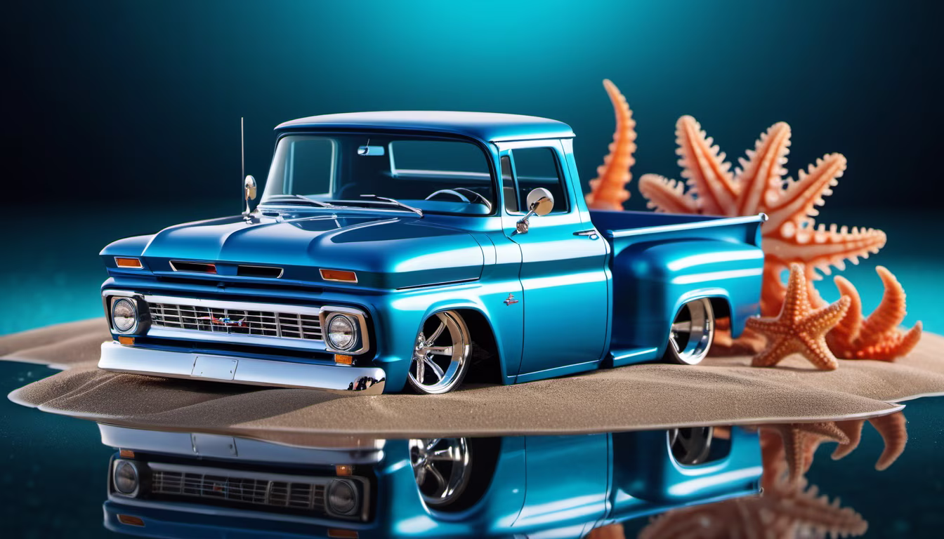 Prompt: 1965 Chevy truck C10 short wide bed lowered slammed to the ground lowrider, with water under the vehicle reflecting image of the truck, ocean bioluminescence waves on the background, the driver is on packed kinetic sand sculpture hd 32k 3d incredible deblur, sharpen, denoise, clear water showing coral reef, seahorses, jellyfish, starfish, fantasy art, real photo amazing texture lifelike art