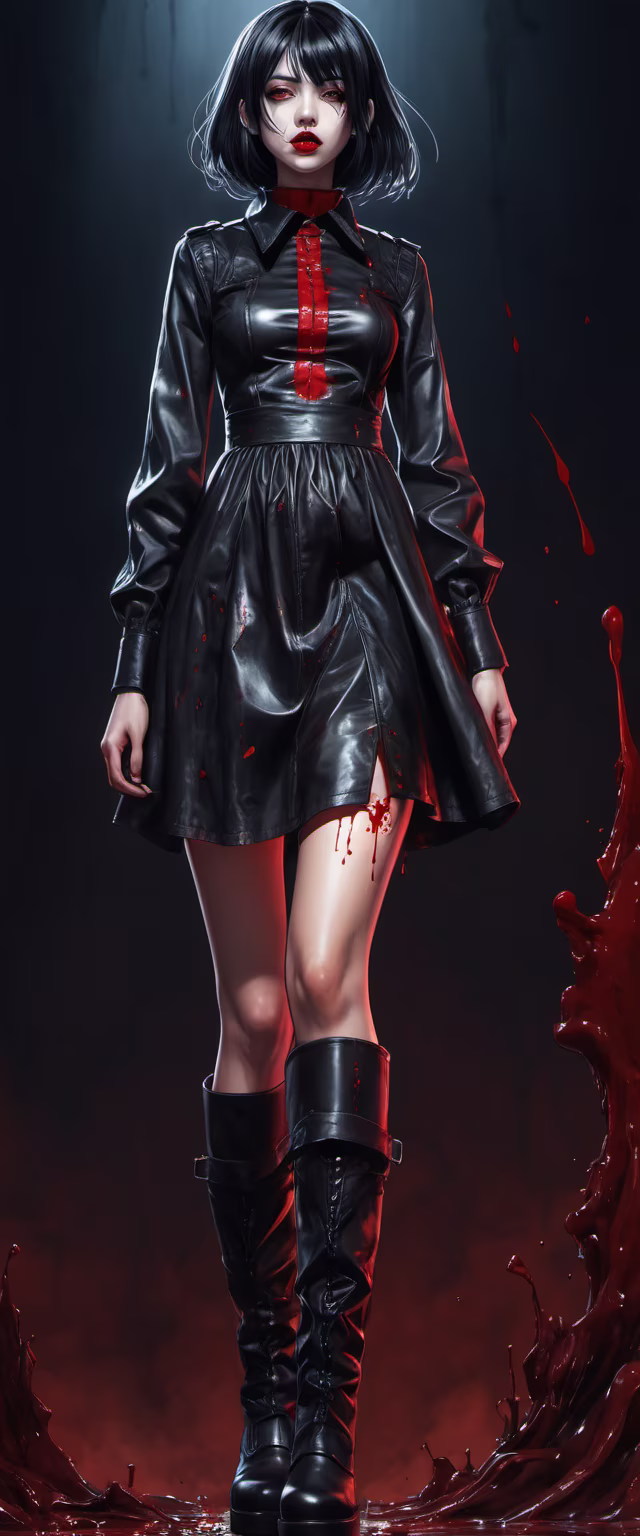 Prompt: A woman without beautiful black hair tall and red lips wearing all leather dress and boots and smocking with some blood stain on her dress and the background is a dark .
