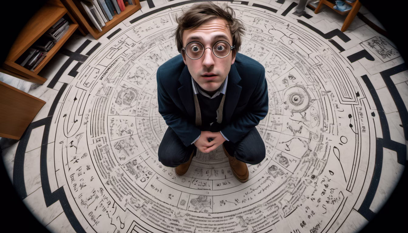 Prompt: A wide-eyed individual, captured from an aerial fisheye perspective, squats on the floor, their face etched with wonder and curiosity. Above them, the distorted lens accentuates the vastness of the scene. Surrounding the individual, ethereal mathematical equations, intricate schematics, and arcane symbols hover suspended in midair, creating a mesmerizing tableau that embodies deep thought and introspection.