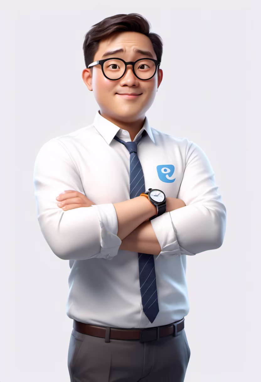 Prompt: Asian, male, using rounded glasses, small mole on right cheek, white long sleeve shirt, wear smartwatch, cross-armed, half body, smiling to the camera, chubby 3D Pixar style, 4K, portrait, white background.