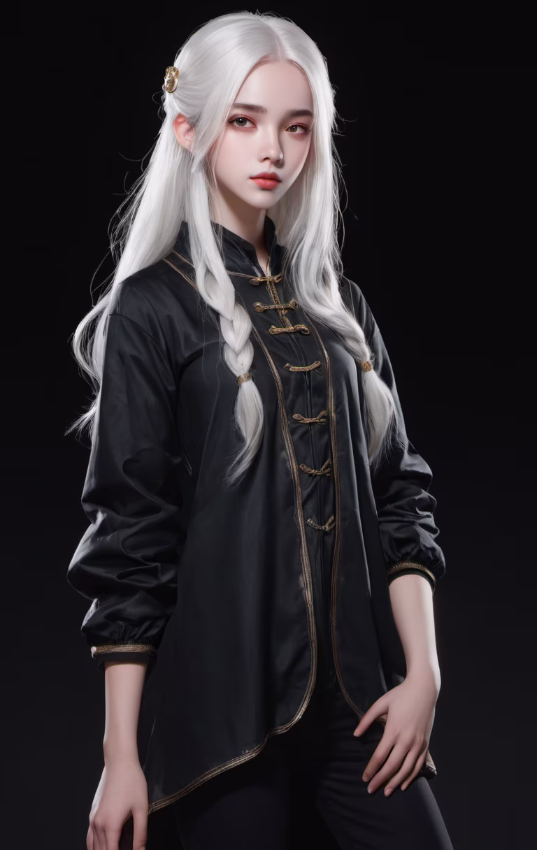 Prompt: \u003clora:MengX girl_Mix_v30:1\u003e, highres, masterpiece, highest quality, extremely detailed, extremely detailed eyes, 1 girl, demure teenage girl, delicate fair face, deep expressive eyes, comfortable casual clothes, youth yet poised, an ethereal dreamlike vision, a visual spectacle, full body portrait, 20 years old gorgeous Chinese girl, very big round gold eyes, long white hair, pure black background, looking at camera, standing, facing front straight-up, cold expression, anime