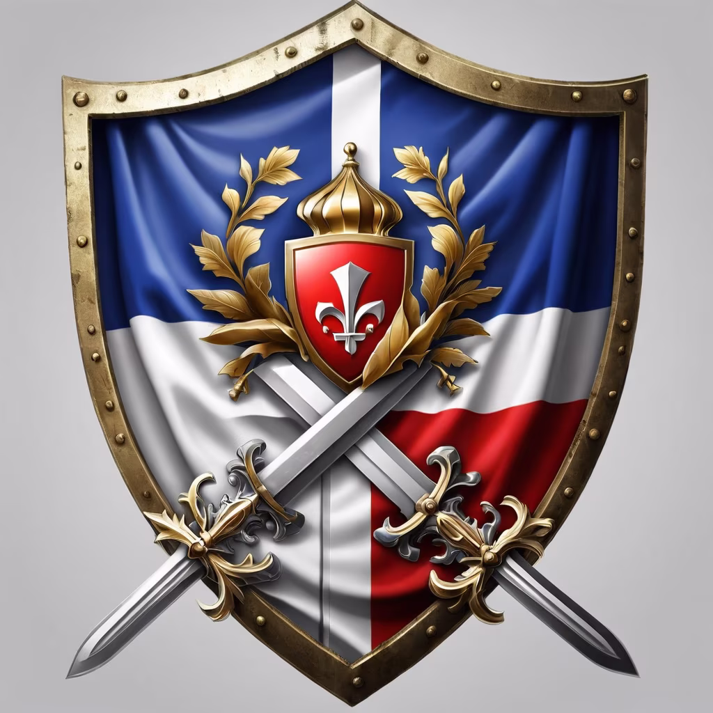 Prompt: imagine a logo with the word ''french legion'' on a french flag shield and 2 cross sword