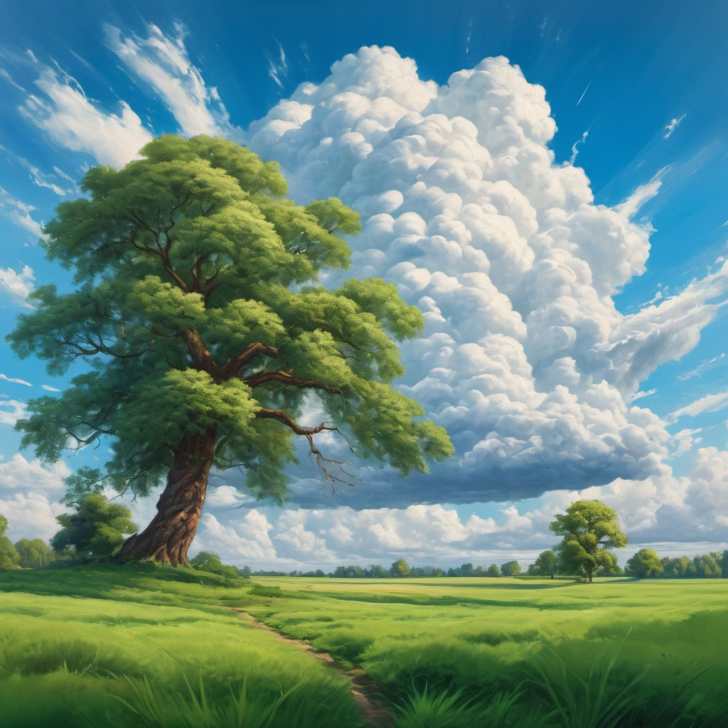 Prompt: Oil painting style scene, green grass, a huge tree in the distance, a huge cloud in the blue sky, clouds and trees are connected together.