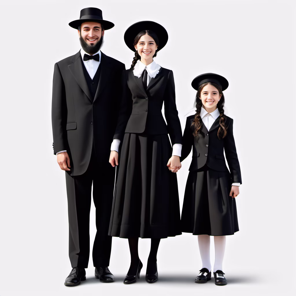 Prompt: Rich in details, an orthodox Hasidic Jewish family, father with a cap and a black Hasidic suit, mother with a wig and a black English-style hat on top, the girls with beautiful long and modest dresses, long sleeves, wearing tights, the boys with a cap, smiling, happily, digital art illustration style, White background, clean and tidy, Disney style, HD, 4K, cartoon, Pixar style without arguments