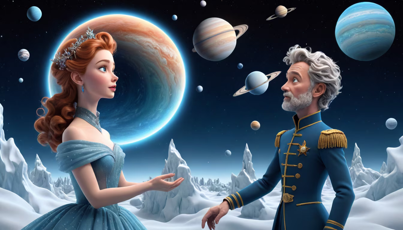 Prompt: Saturn's dynamic dance (swirling patterns). Neptune's frozen ballet (serene icy scene). Cosmic backdrop (stars and galaxies). Journey through space (spacecraft or comet trail).\"