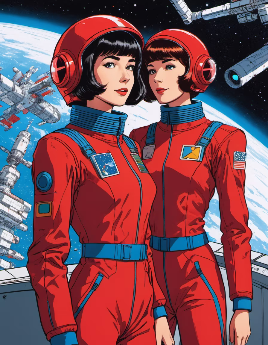 Prompt: Pen and ink, illustrated by hergé, a red futuristic robot holds the hand of a gorgeous brunette in red spacesuit , inside a space station overlooking the earth at night, stunning color scheme, masterpiece