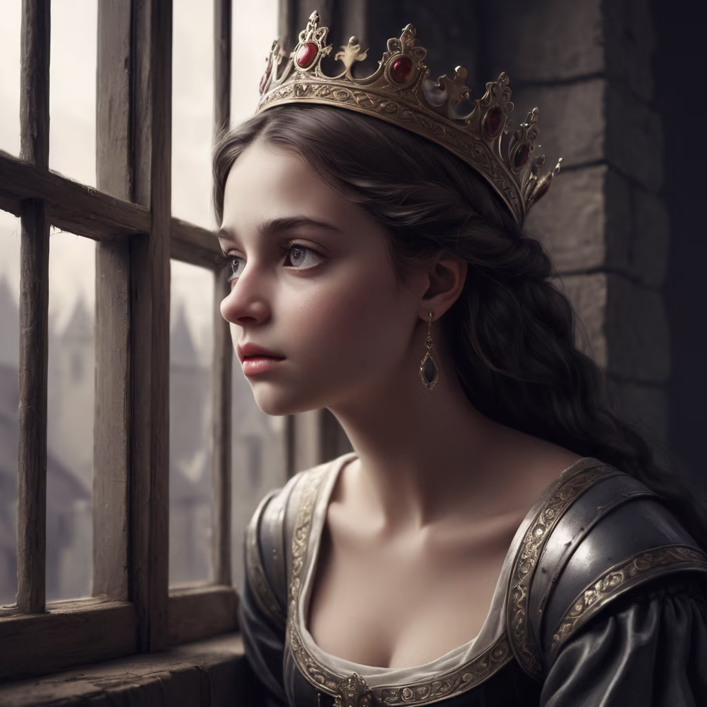 Prompt: realistic book illustration, a young queen looking out the window, very nostalgic, sadness, realistic medieval photo, nostalgic lighting, cool tones, melancholic atmosphere, magical spell, high detail, digital painting, fantasy art, intricately detailed, illustration but very realistic, magical realism