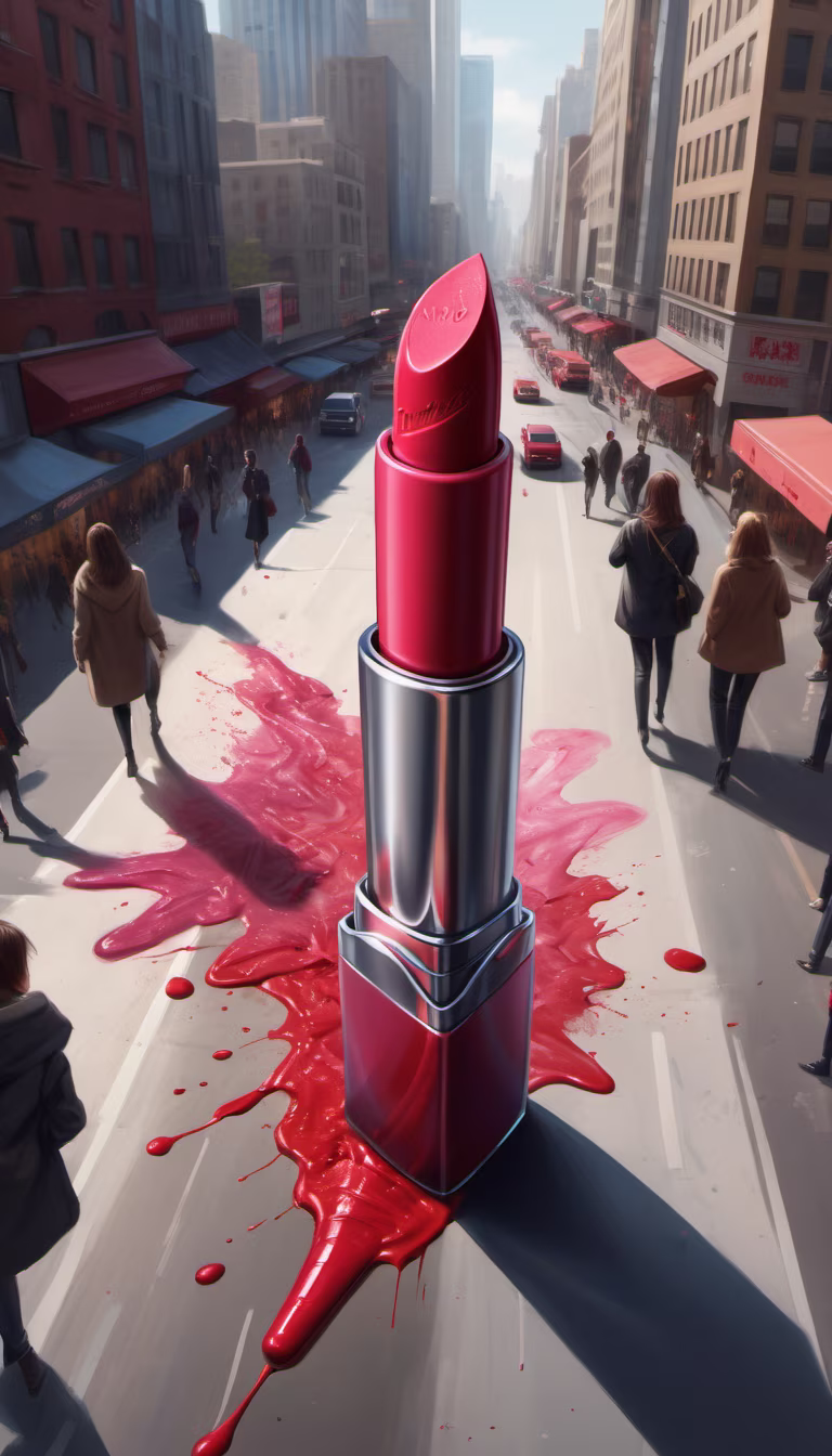 Prompt: A massive lipstick painting the tall skyscraper surface, realistic