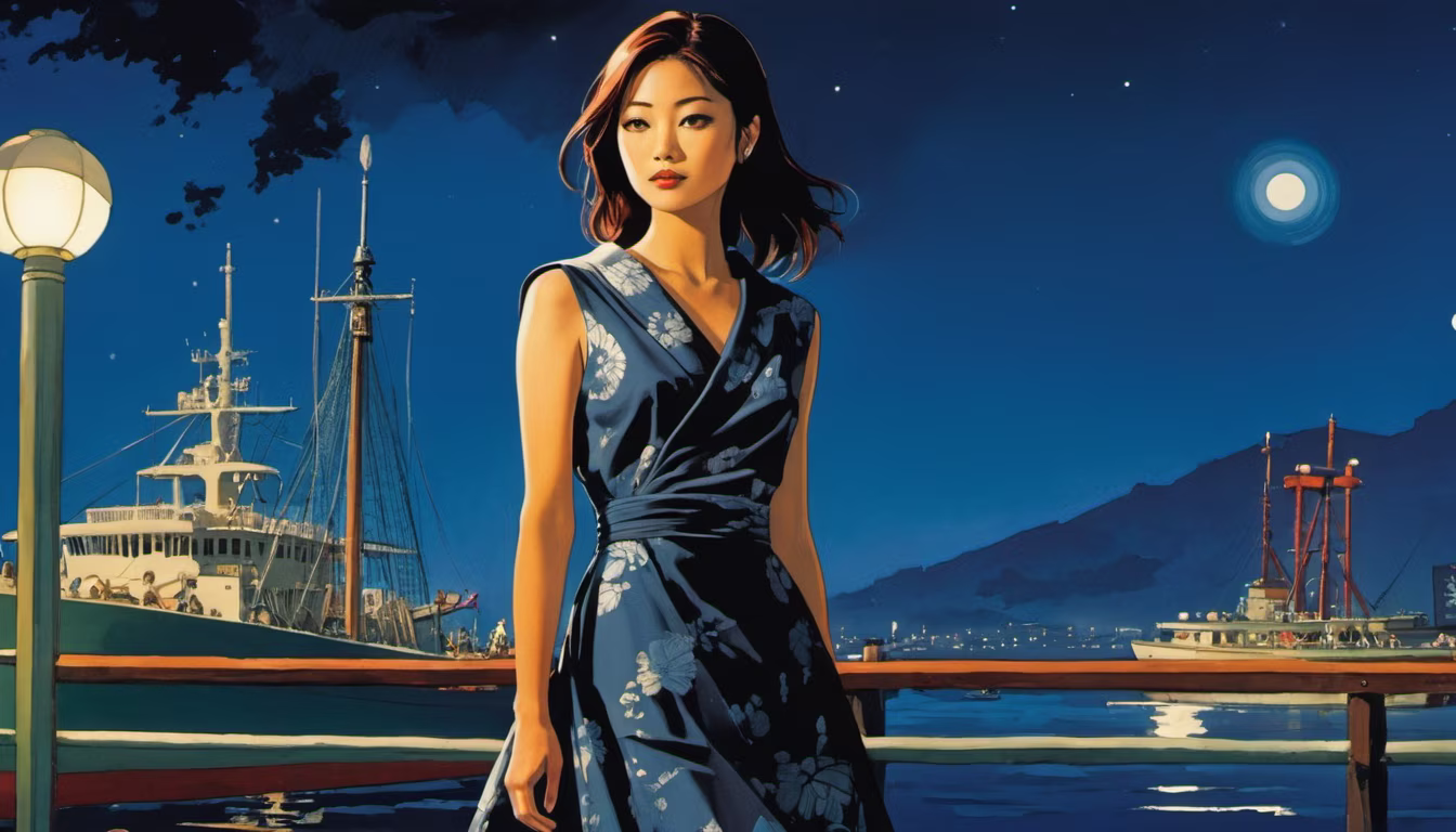Prompt: full body, impressionistic dramatic world, 25-year-old Japanese woman (Aya Ueto), dressed in a short dress, standing on a dock in the harbor, with the ships and the ocean in the background, night, moon, twilight, dramatic pose, The delicate strokes and subdued colors capture the atmosphere, emphasizing the emotions of the characters, 60s, Japanese art, Japanese style, dark gray colors, detailed facial features, detailing, detailed background, quality, by Alex Ross Frank Miller