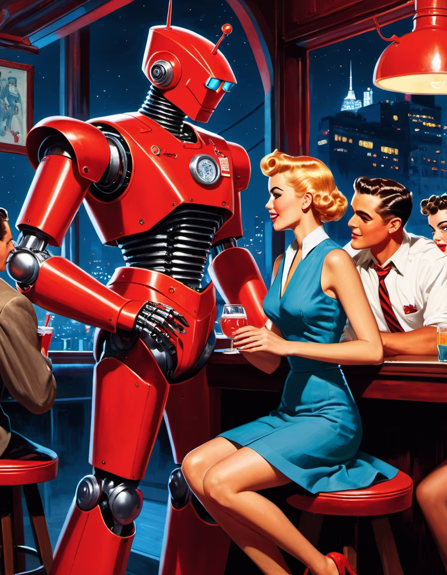Prompt: painting of a big red robot in a night bar with gorgeous pin up girls and boy drinking, in New York city at night, painting by Norman Rockwell