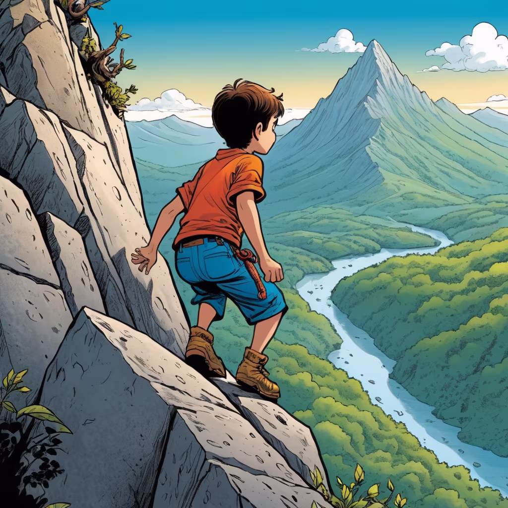 Prompt: a little boy, Brown curly hair, Standing on top of a mountain, look into the distance