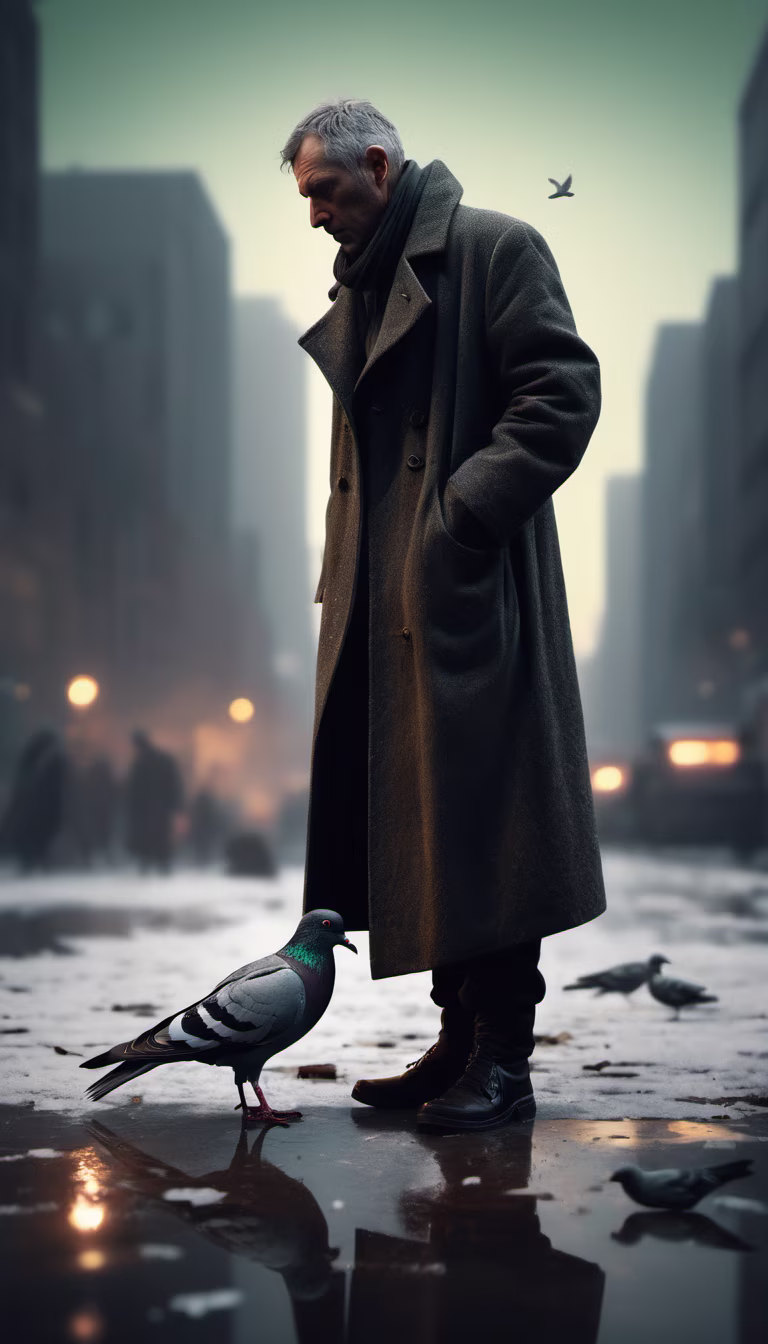 Prompt: walking along a wintry landscape by the riverside, a black-clad assassin comes across an injured pigeon. Their attention is drawn to the wounded creature, and a mix of curiosity and concern fills their eyes. The assassin approaches the injured bird, contemplating their next course of action. The aim is to highlight the unexpected encounter between the assassin and the injured pigeon. blade runner subsurface scattering, 35mm/polaroid, sanguine, celadon, amber, desaturated, faded, dirt corrosion, double exposure, light pollution, aged, scratches, blemishes, torn, burnt, dark green, amber, black, desaturated