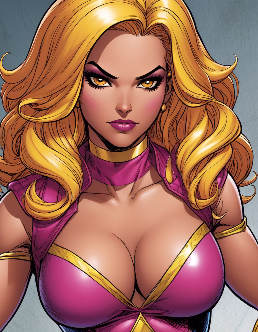 Prompt: Sonal chauhan as star saphire from comics,fierce look,bikini costume,realistic,full body shot,uhd,surreal,4k,8k,8