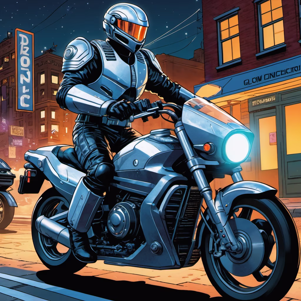 Prompt: 2d cartoon characters, full body, RoboCop, silver armor, armor boots, riding a motorcycle down the street, halo, glow, sparks, radiance, power, strength, luminescence, midnight, moon, paving sidewalk, against a detailed background dark evil street Old Detroit city, MechWarrior style, BattleTech style, cartoon scenes, futuristic, sci-fi, ready to use his power, his might and his weapons, dynamic action pose, dnd character, Marvel Comics style, 80s, animated TV series, dark light, colorful, vibrant color, high detailed background, high detail, best quality, by Jack Kirby, Giger, Frank Mille, Boris Vallejo