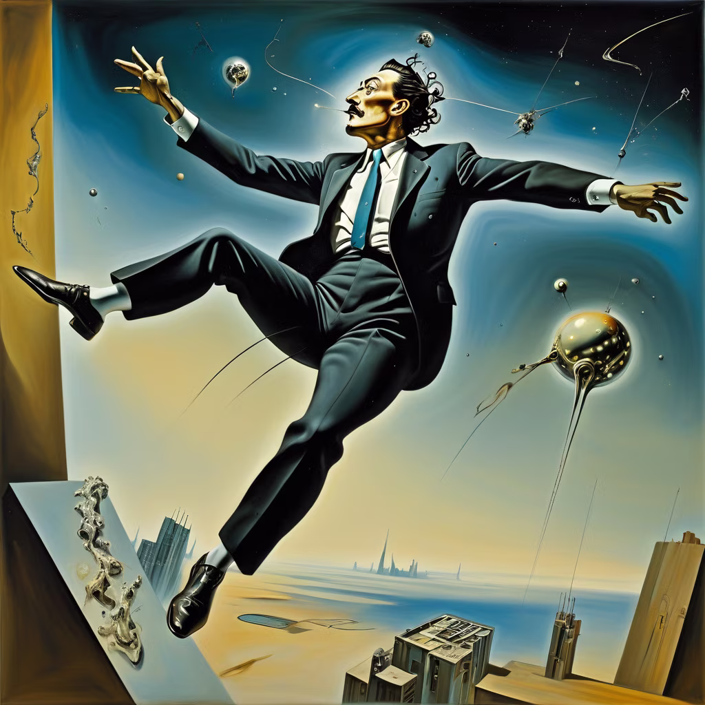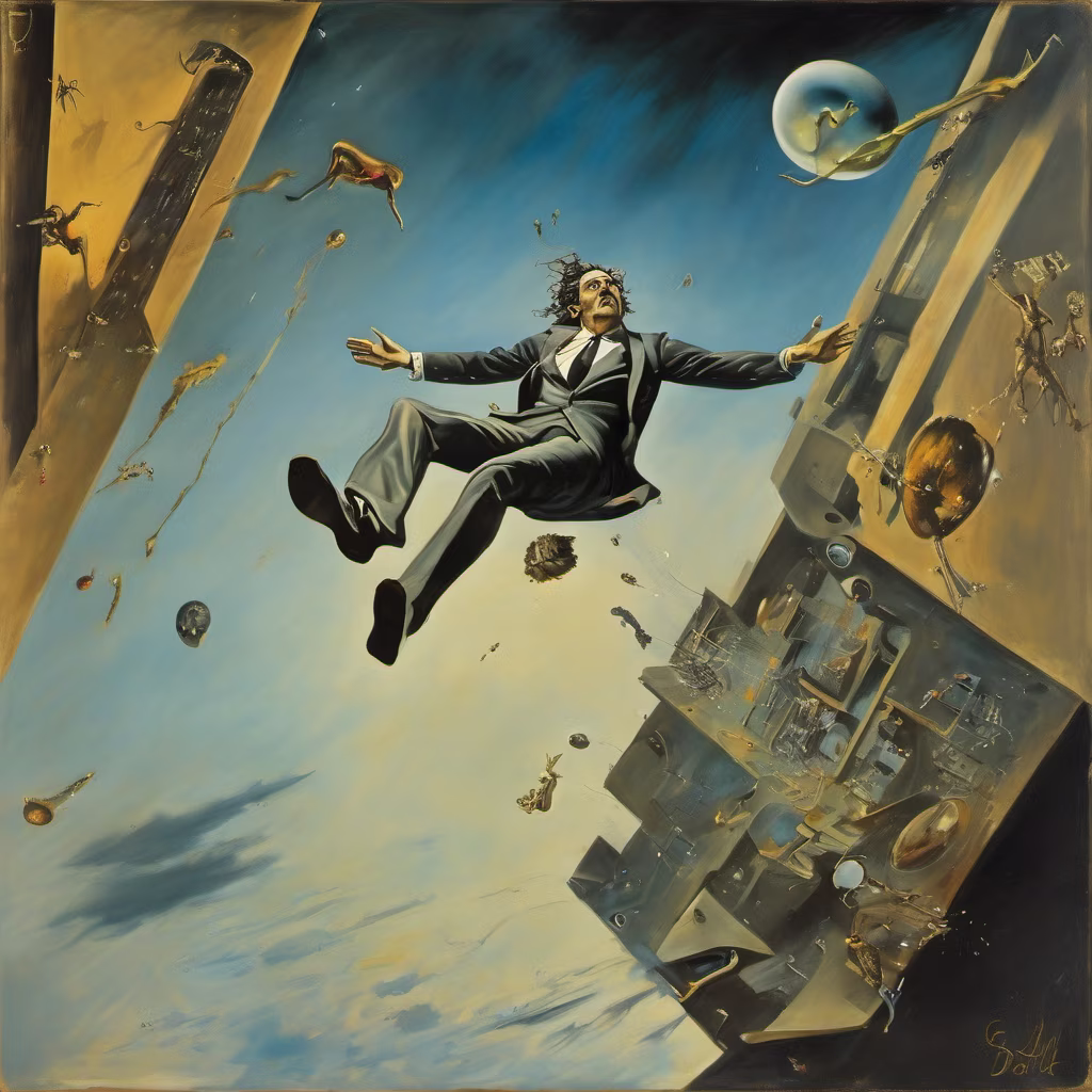 Prompt: Painting of a coporate man falling in the space, by Salvador Dali, cyberpunk, futur, neo-noir, transhumanism