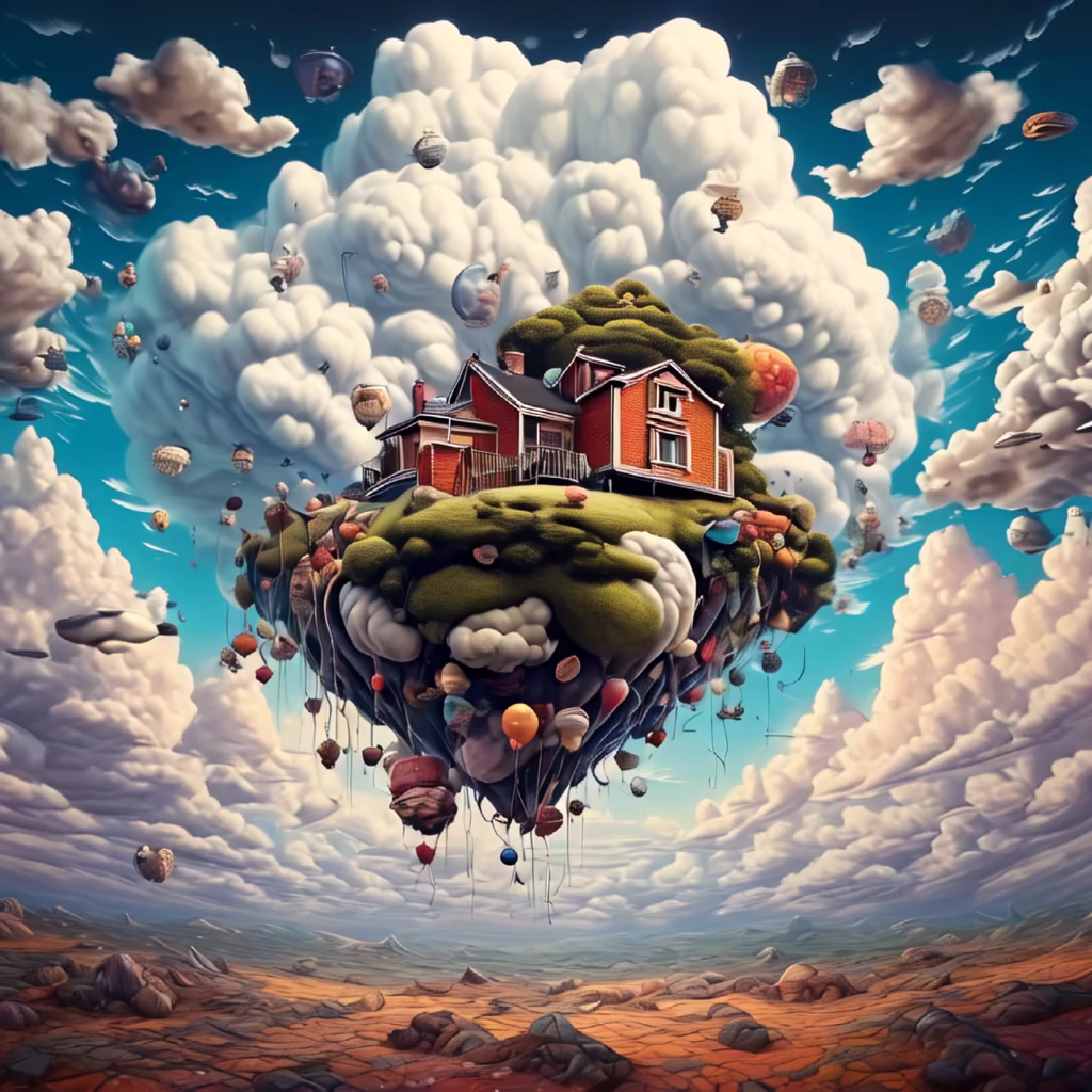 Prompt: A surrealist oil painting depicting a garage suspended amidst billowing clouds in an otherworldly celestial realm. Influenced by René Magritte's dreamlike art, Salvador Dalí's surrealism, and Jacek Yerka's fantastical landscapes. Vibrant colors, dreamy lighting, intricate detailing, and cloud textures. Trending on ArtStation, in 8K resolution.