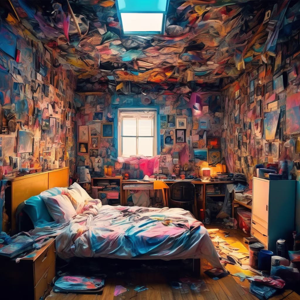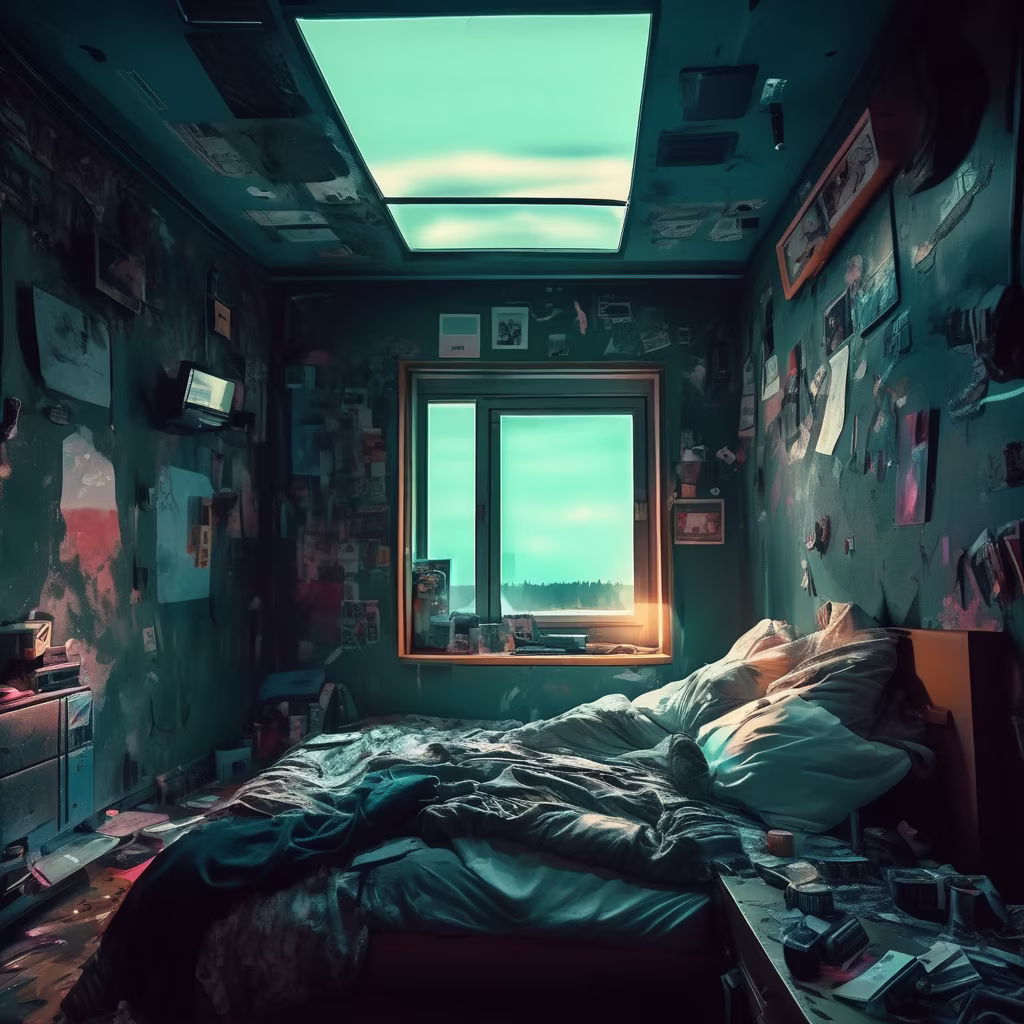 Prompt: A messy bedroom, cyberpunk tones, digital expressionism. Neo's unmade bed, piles of clothes, discarded computer equipment. Top down perspective, as seen through surveillance cameras. Bold colors like early 2000s displays. Grungy sci-fi textures. An open laptop with 'the matrix' code streaming. Half-drunken energy drinks, Japanese comics. Overcast light through a solitary window. In the stylized realism of Simon Stålenhag and Rob Sheridan.