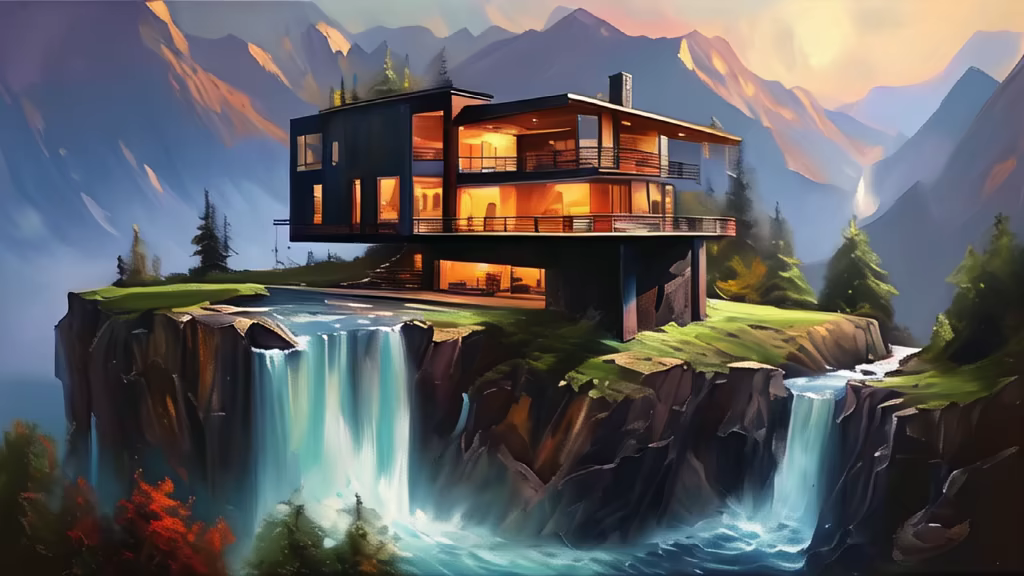 Prompt: oil paint, a modern house hanging off a cliff with panoramic mountain views, surrealistic with exaggerated dimensions and bold, dramatic lighting, incorporate a cascading waterfall beneath the house for a sense of motion