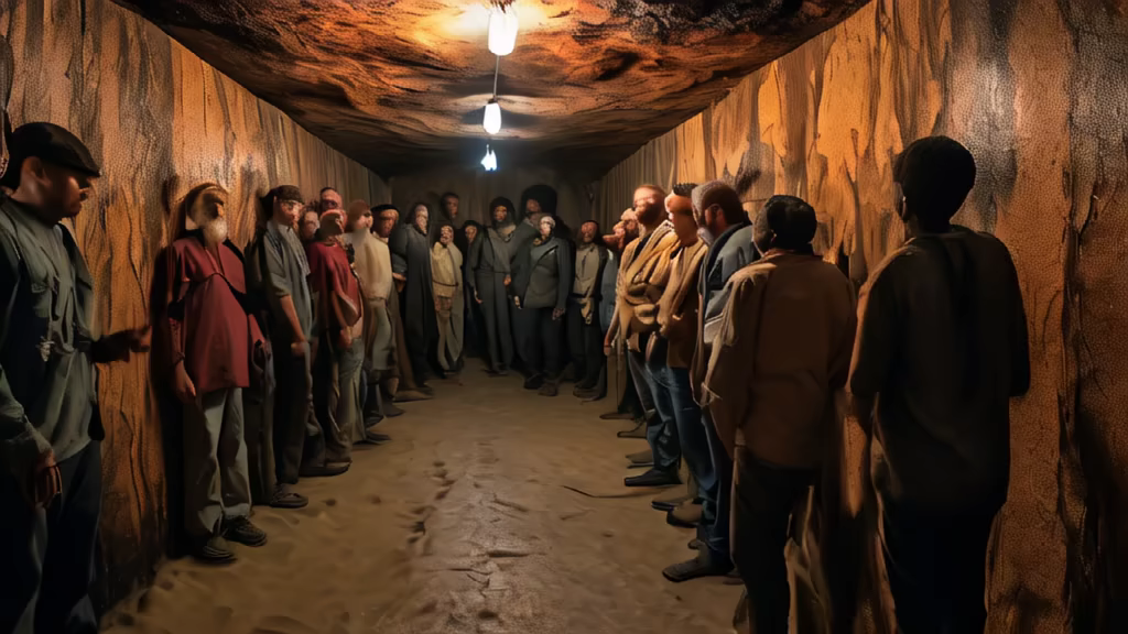 Prompt: Art exhibit, low ceiling, claustrophobic, unfomfortable, subject of work and oppression