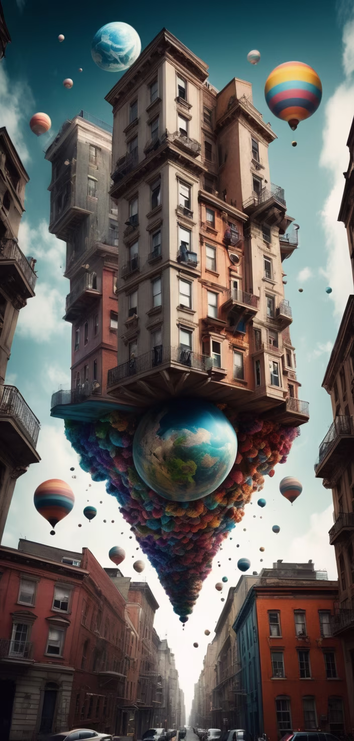 Prompt: color photo of a mind-bending depiction of a topsy-turvy parallel world. The photo captures a scene where the laws of physics and reality are completely inverted, defying all logical expectations. Buildings and structures hang upside down from the sky, while the ground appears to be suspended above. Gravity seems to have lost its grip, as people and objects float freely in the air. The colors are surreal and disorienting, with vibrant hues swirling and blending in unconventional ways. This photo invites viewers to question their perception of reality and embrace the limitless possibilities of an upside-down universe. It sparks a sense of wonder and curiosity, as we contemplate the existence of alternate dimensions and the mysteries that lie beyond our own. It is a visual representation of the fantastical and the extraordinary, challenging our preconceived notions and inviting us to explore the boundaries of our imagination. This photo serves as a reminder that reality is not always as it seems, and that in the realm of the unknown, anything is possible. —c 10 —ar 2:3