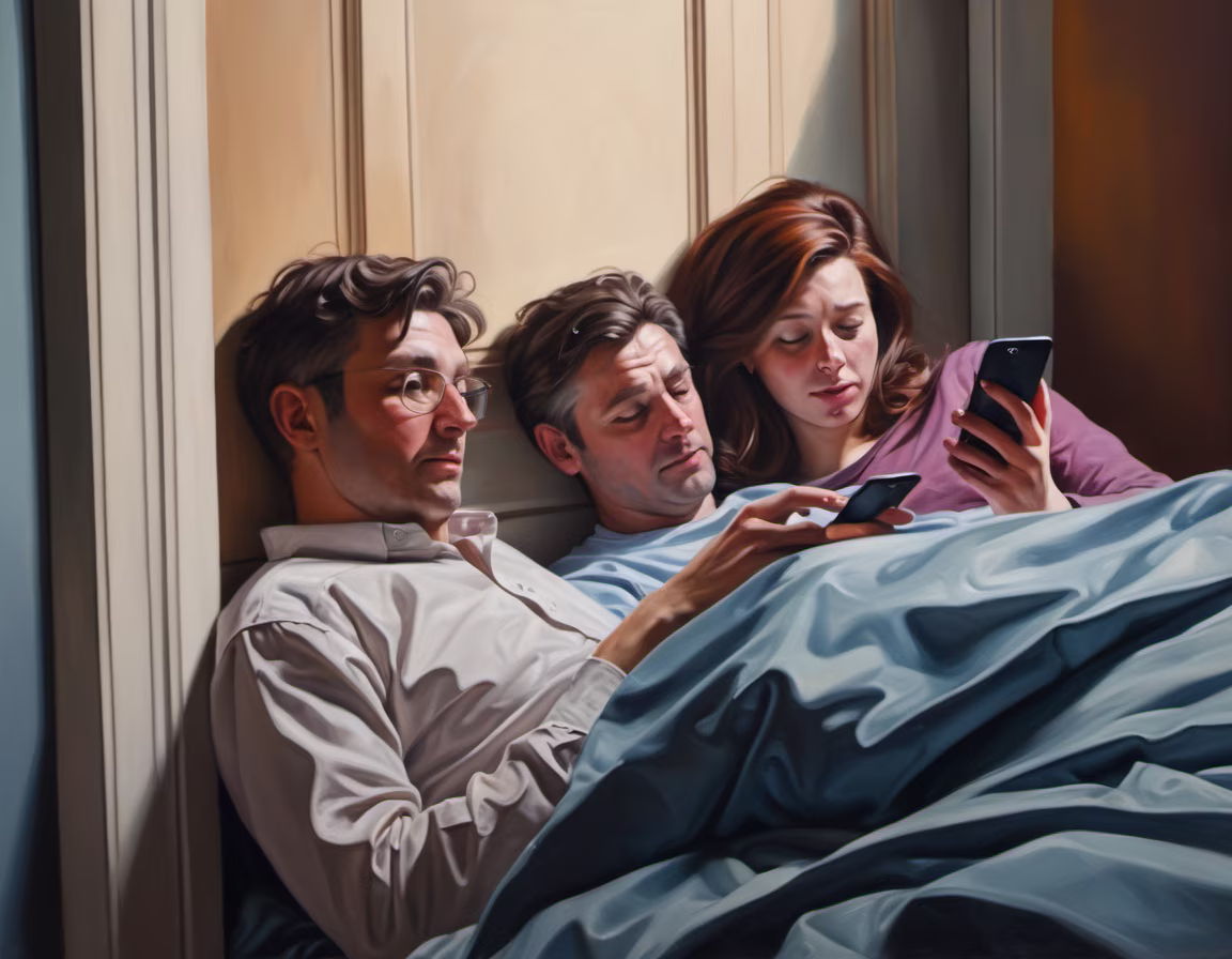Prompt: oil painting ,a couple lying in bedbehind the door ,looking at their phones. the proportion of people is very small.