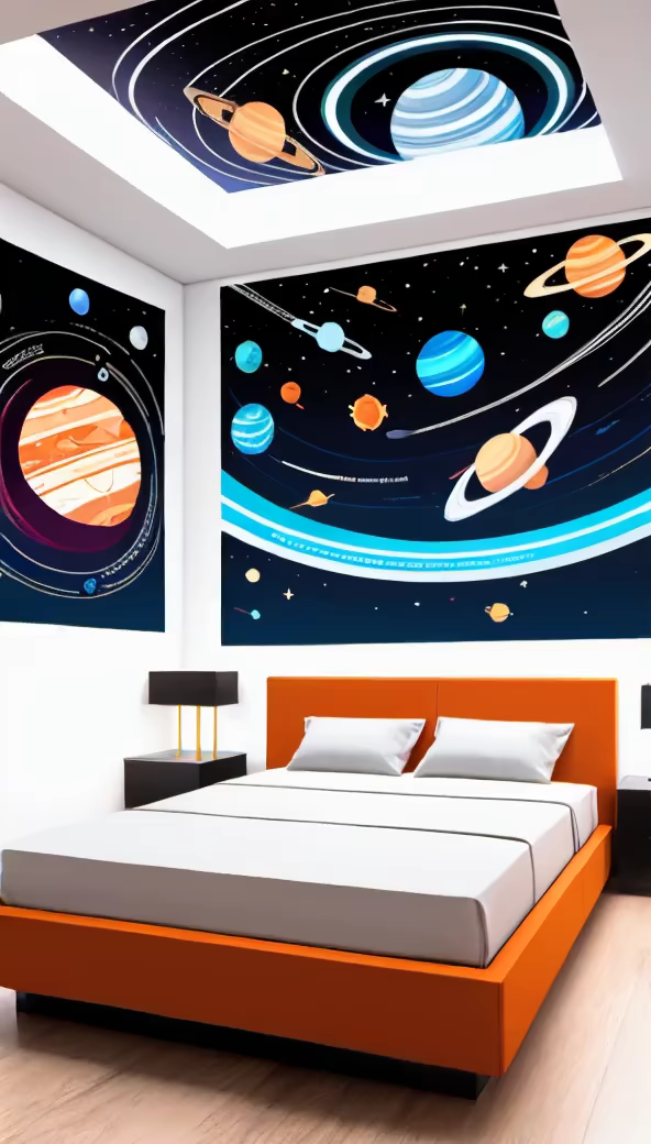 Prompt: a 360° view of a room with a narrow bed, white walls decorated with various images representing the planets, galaxies, the cosmos