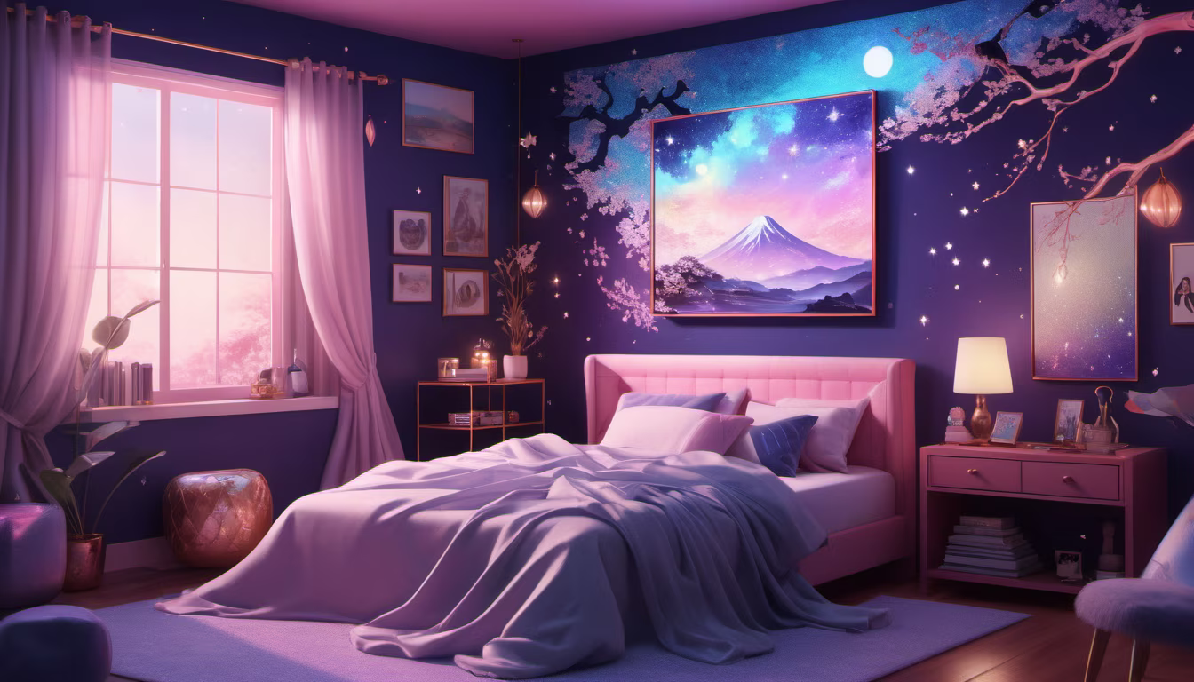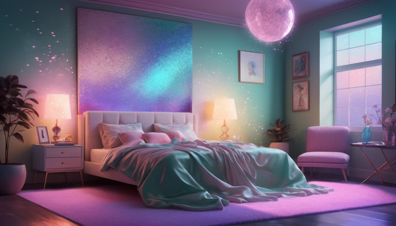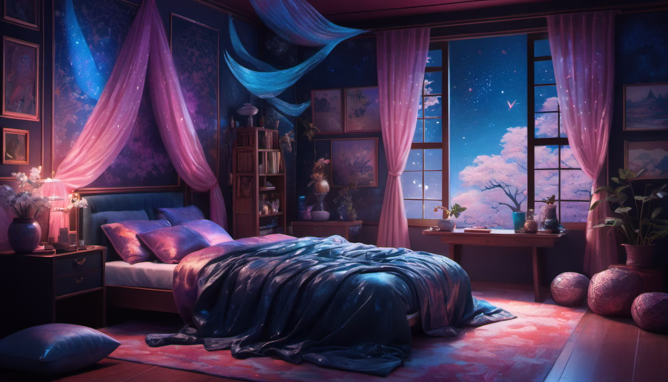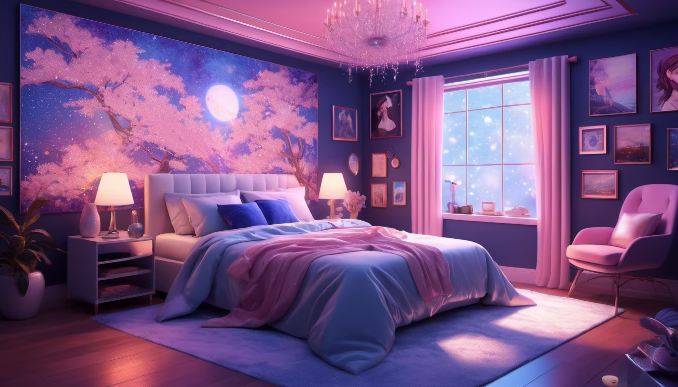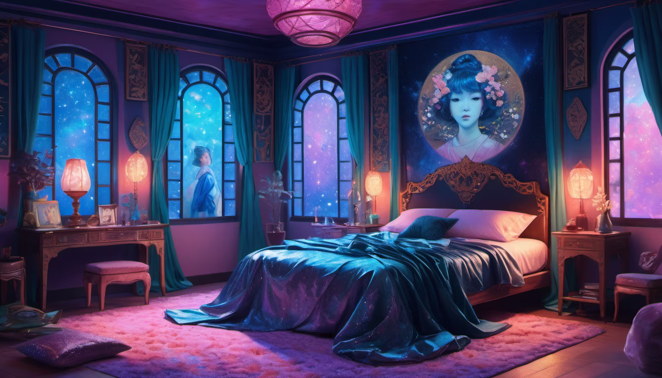 Prompt: Painting of the interior of a dream bedroom inspired by Adrianne Walujo , Yanjun Chang,Sarita Nanni, smooth style, kdrama style ,Vashti Harrison , hologram effect, iridescent, fairy and cinematic, cute style, Dylan Andrews light , glitter gel effect, shinny, brillany, diffused light, clair-obscure, fairy fantasy, Rebeccas Dautremer ,Katsushika Hokusai, overdetailed, good vibes, 4K realistic.