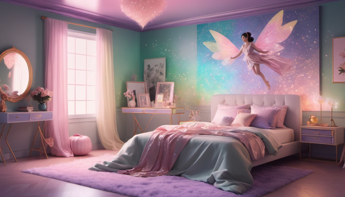 Prompt: Painting of a dreamlike bedroom inspired by Adrianne Walujo , Yanjun Chang,Sarita Nanni, smooth style, kdrama style ,Vashti Harrison , hologram effect, iridescent, fairy and cinematic, cute style, Dylan Andrews light , diffused little sparkle, glitter gel effect, shinny, brillany, diffused light, clair-obscure, fairy fantasy, Rebeccas Dautremer ,Katsushika Hokusai, overdetailed, good vibes, 4K realistic.