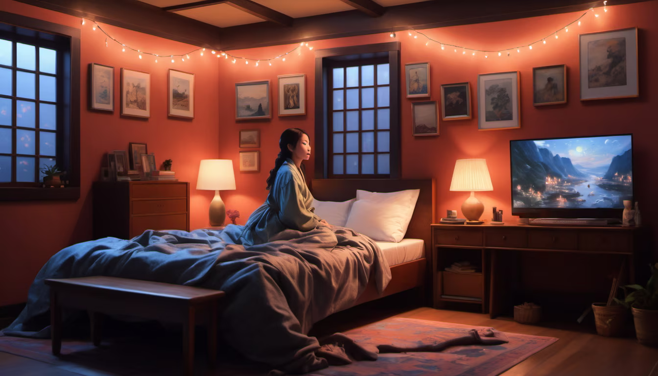 Prompt: Painting of the interior of a bedroom of kdrama inspired by Adrianne Walujo , Yanjun Chang,Sarita Nanni, strong chiaroscuro, smooth style, kdrama style ,Vashti Harrison , holographic light , fairy and cinematic, cute style, Dylan Andrews light ,Rebeccas Dautremer ,Katsushika Hokusai and Pieter Brueghel overdetailed, good vibes, 4K realistic, woman,