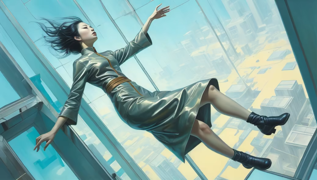 Prompt: Painting of an overview of a ultra futuristic chinese woman falling on a glassroom, inspired by Rebecca Dautremer, popsurrealism, robot punk futuriste,Zdzislaw Beksiński , Asian- futurist style, Dorothea tanning, tom bagshaw,Aurelie neyret and benjamin Lacombe