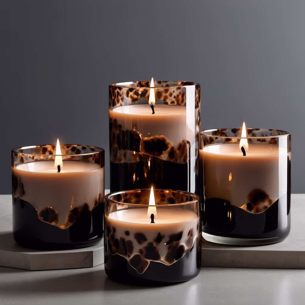 Prompt: tortoiseshell glass candles, featuring a stunning combination of taupe, black, and gold infused within the glass. Large and Small Sizes in different shapes, these candles offer a unique and creative touch to any space. Enjoy the front view of these exquisite pieces as they light up your room