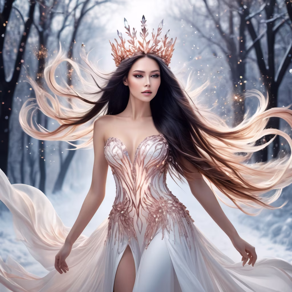 Prompt: create a woman wearing a white dress made from shards of luminescent white crystal, long hair, flowing hair colors rose Gold , Black hair, very beautiful, anthropomorphic photography, beauty of a woman, beautiful woman, with long flowing hair, long hair, perfect woman, impeccable makeup, beautiful woman, with crystal tiara, magnificent winter background, winter magic in the background, glitter in the background