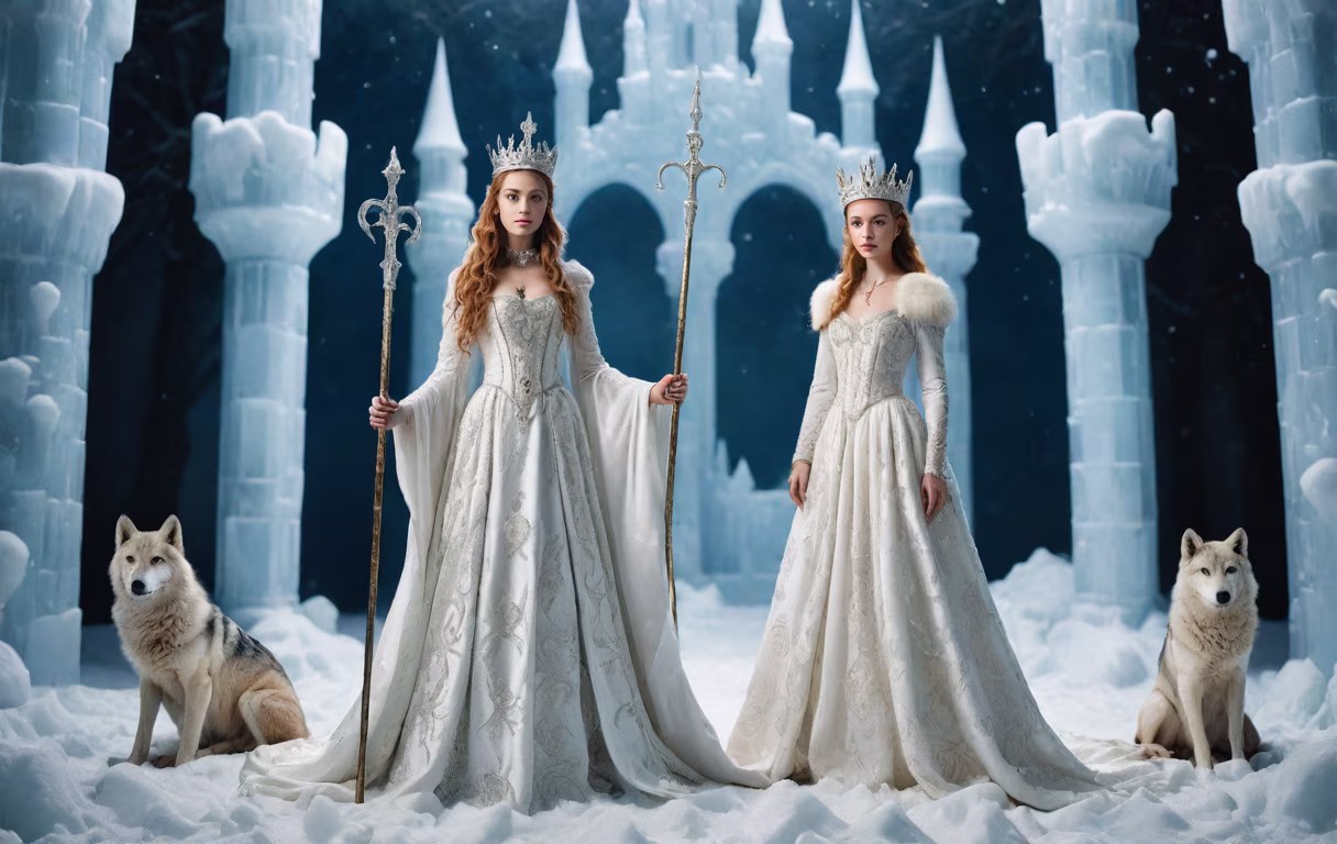 Prompt: Baroque ice castle backdrop, the Snow Queen stands tall in white attire, adorned with a crown and a two-meter staff topped with a crescent moon. Two wolves, one white and the other black, accompany her. The scene exudes regal details akin to the styles of George Frederic Watts, Edmund Leighton, Alexandre Cabanel, and Herbert James Draper.