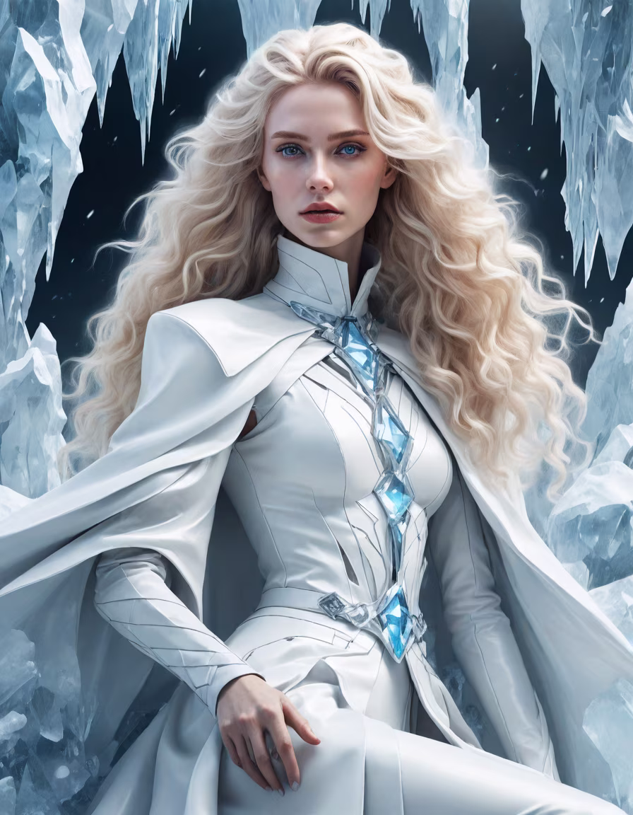Prompt: by Arca artstyle, Arca album cover, experimental art, experimental type of art stunning, abstract, illustration, huge hair blonde woman in white dress sitting on a futuristic montain of ice, cyborg fashion shot, vogue magazine conceptual poses, modeling photograph, art digital, artstation style, futuristic and ethereal, white witch, ice queen, fashionable futuristic woman, futuristic fantasy, queen of ice and storm, detailed face, detailed hands, big blonde hair, elegant futuristic ice princess
