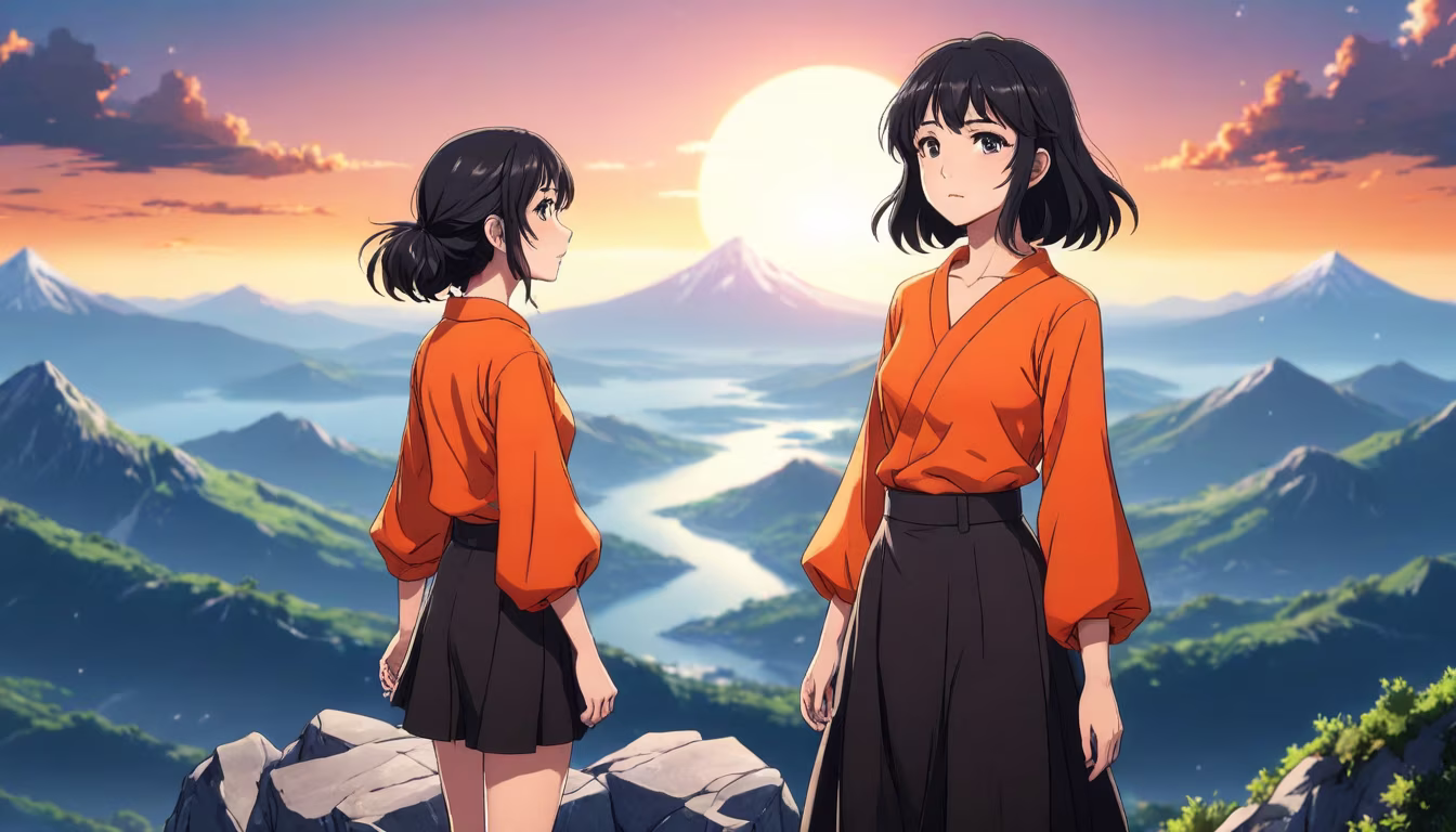Prompt: Standing on the top of the mountain, a mature and elegant black-haired beauty, wearing an orange casual top, gazing at the vast land, symbolizing unlimited possibilities and the future. She stretches out her arms as if to embrace the whole world. The lighting in the image emphasizes the awakening of potential and the beauty of the future. Panoramic vision, masterpiece, high quality, 8K. Soft light.