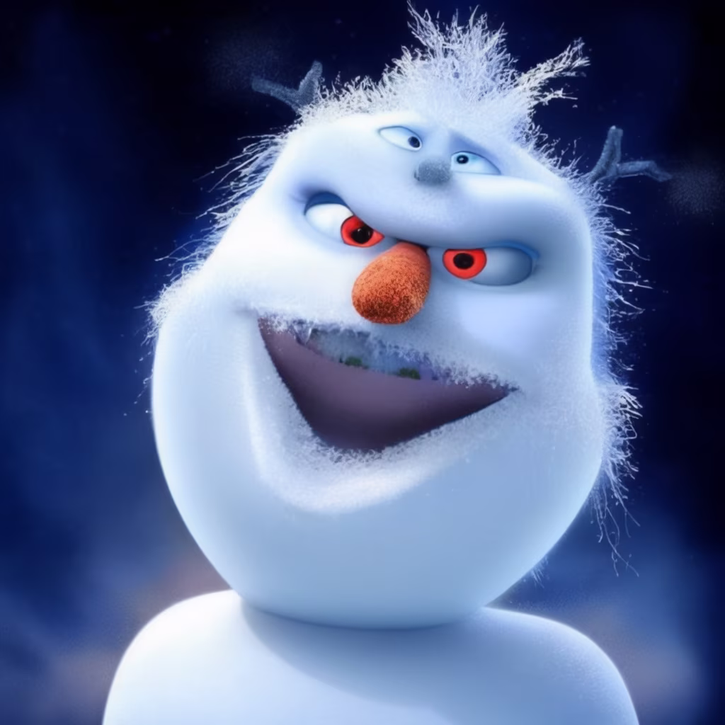 Prompt: Envision Olaf from 'Frozen,' a character known for his jovial nature, unexpectedly possessed by a malevolent demon, turning the beloved snowman into a nightmarish and unsettling figure.