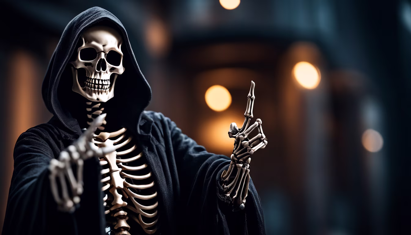 Prompt: a serious faced skeleton that looks goofy in that it is staring at the camera