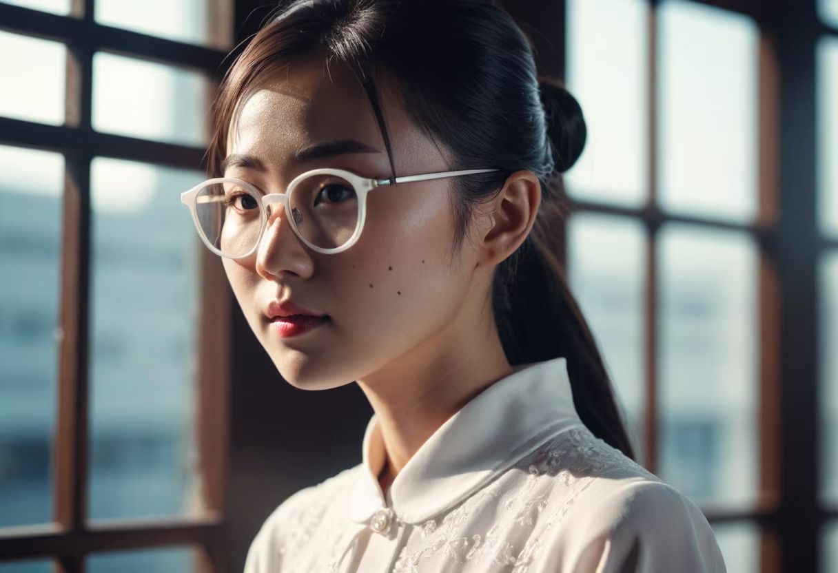 Prompt: a chinese girl, white dress, glasses, window side, sunlight, 4k, perfect detail, canon photo quality