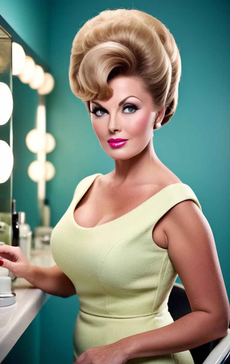 Prompt: Year:1968. High detail, UHD, 8K resolution, sharp focus, full color, low angle, medium close up, candid, intimate portrait of an alluring, age 35 Icelandic wife in a beauty salon in 1968. Her thick, luxuriant, straight blonde hair is styled in a lofty, voluminous, long bouffant, with thick bangs. She is wearing a summer dress. Accurate 1968 styling.
