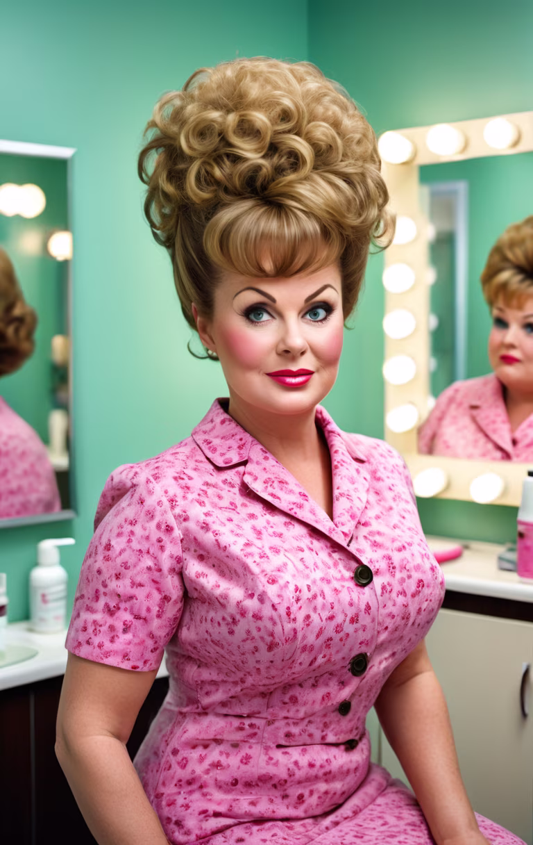 Prompt: Year:1963. High detail, Canon EOS DSLR photograph. UHD, 8K resolution, sharp focus, full color, low angle, close up, photorealistic, candid, intimate headshot portrait of a fashionable, serious, cerebral, full-figured, voluptuous, age 50 wife at a beauty salon in 1963, emphasizing and showing all of her fresh new hairstyle. She has a short, curly, intricately detailed, richly textured, luxuriant, precisely curled, neatly arranged, tapered bouffant updo. Accurate 1963 styling.