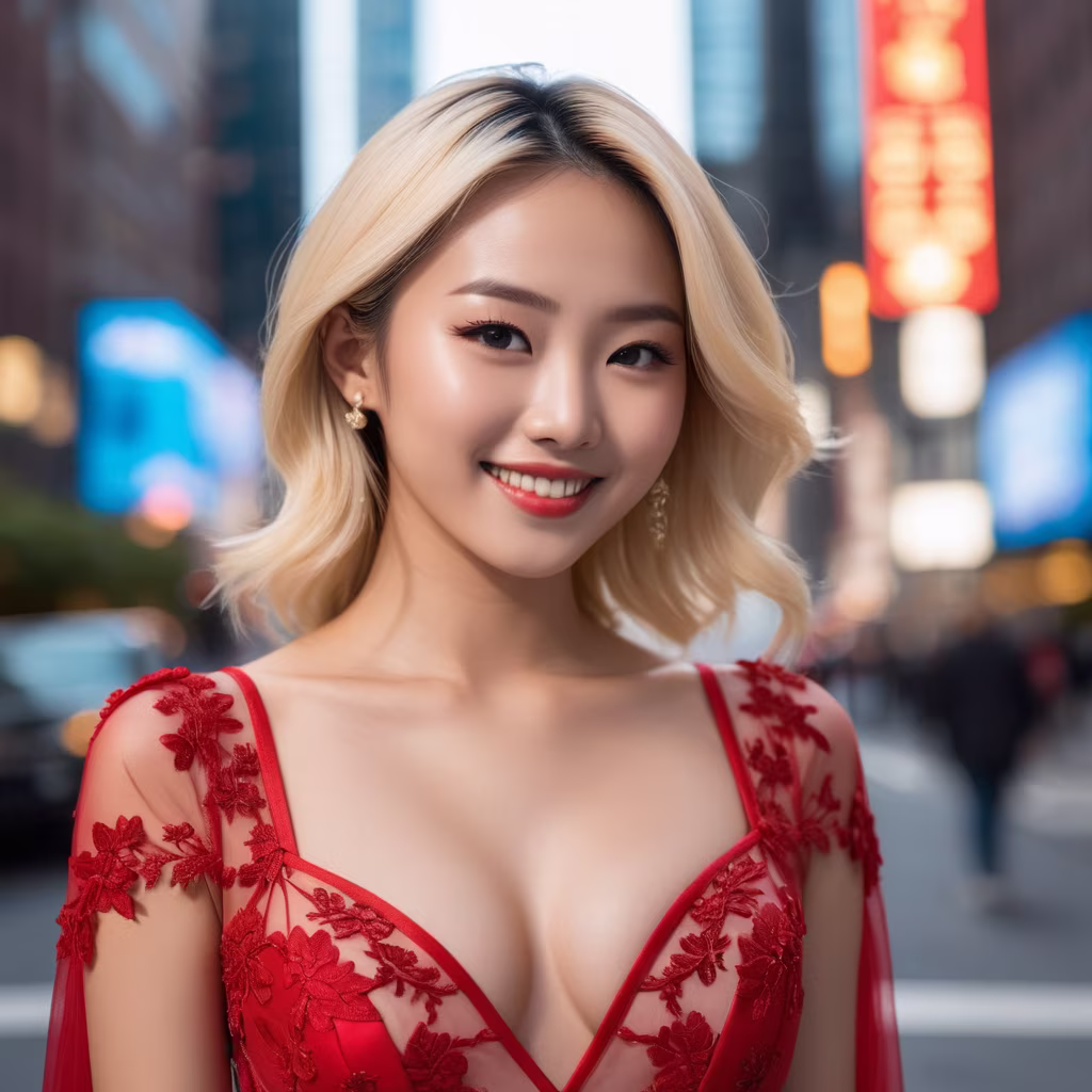 Prompt: 8K quality, ultra-realistic style, magazine cover photography, portrait photography, telephoto mode, there is a 28-year-old young blonde Asian beauty, judy, wearing a red wedding dress, in the streets of New York, smiling and looking at the camera in front of the background is a lot of skyscrapers