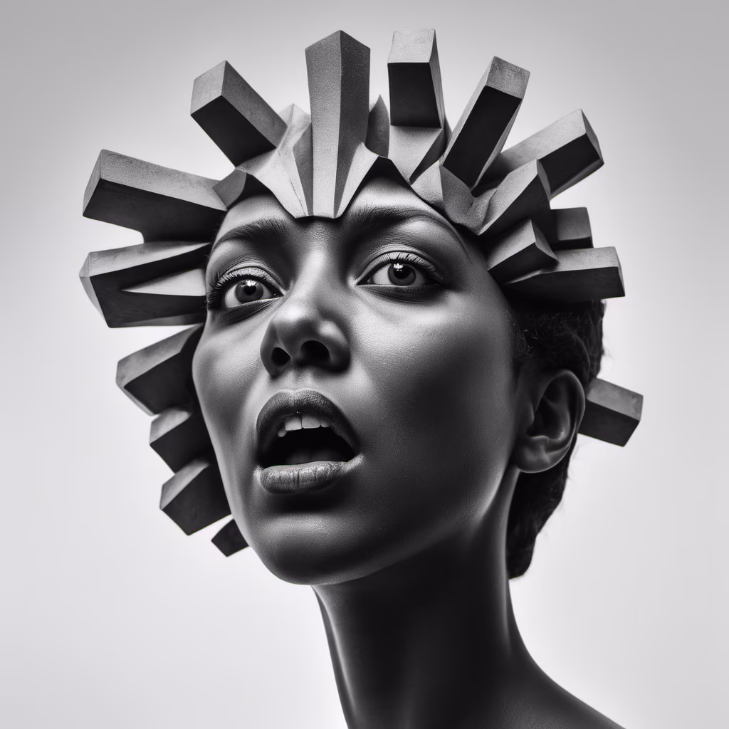 Prompt: a black and white photo of a woman's face, a surrealist sculpture, inspired by Igor Morski, hyperrealism, 4 heads, black people, show from below, trending on juxtapoz magazine, shouting, anna dittman, scream