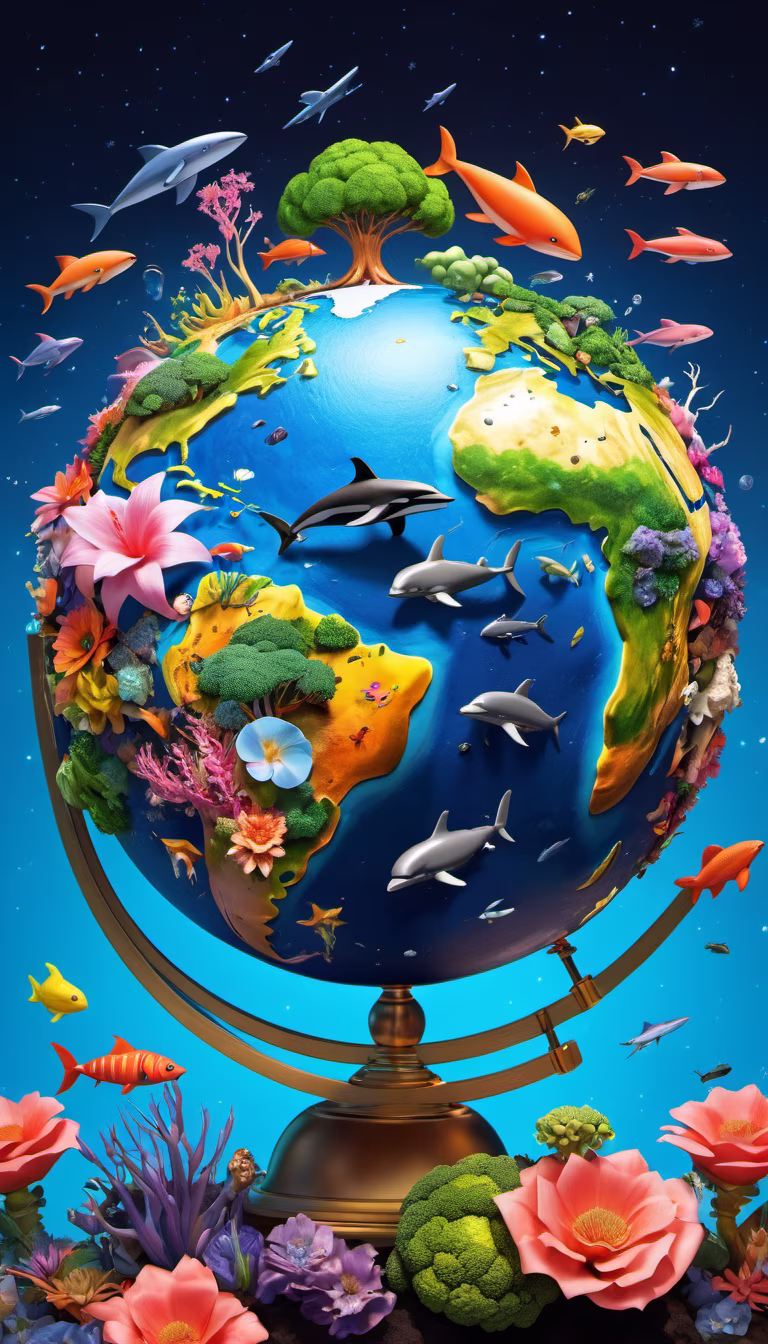 Prompt: globe of earth surreal 3d model of planet earth with flowers instead of stars in the night sky, fish, broccoli, pig, monster truck. Dolphin, coral reef, monster aliens, Ninja characters, lots of chaos compilation with fighter jets flying across the globe in seconds hypersonic incredible art real photo unreal ethereal