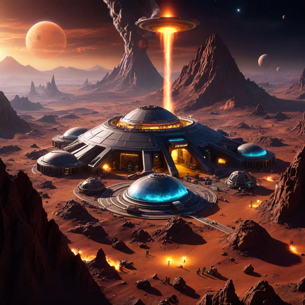 Prompt: 8-bits, Alien Fall Base (Very detailed) In the mountainous desert,8-bits, There are several exhaust fans and yellow chimneys, Some neon lights come out of the base to illuminate the dark place, 8-bits, (Extreme nights), Some clouds in the night sky, Some of the surrounding planets provide air to unknown planets,The farthest giant volcano is erupting, 8-bits
