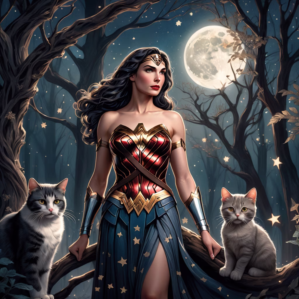 Prompt: wonder woman, standing in a moonlit forest, surrounded by glowing stars, the scene is highly detailed, Intricate, and smooth, with a touch of vintage charm, the witch wears an elegant gown adorned with floral patterns, while her cat familiar perches on a mystical tree branch, the moonlight casts a soft, ethereal glow, illuminating the enchanting atmosphere, this digital painting captures the essence of tribal art nouveau style, reminiscent of alfons mucha's iconic works, with a modern twist