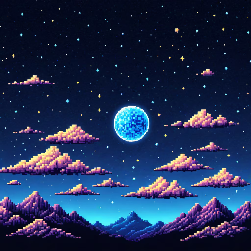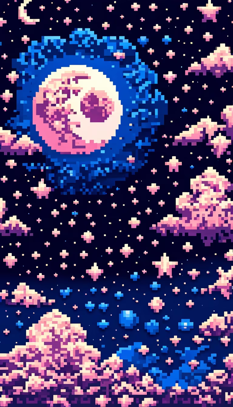 Prompt: moon and stars with a cloud on the background pixel art style 16bit nebula astrological design dark blue with light pink pointillist optical illusions wallpaper