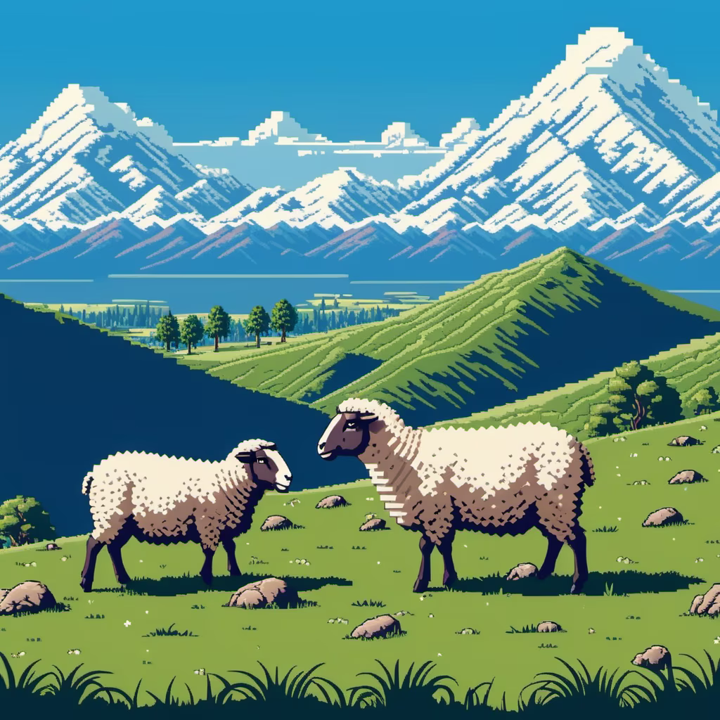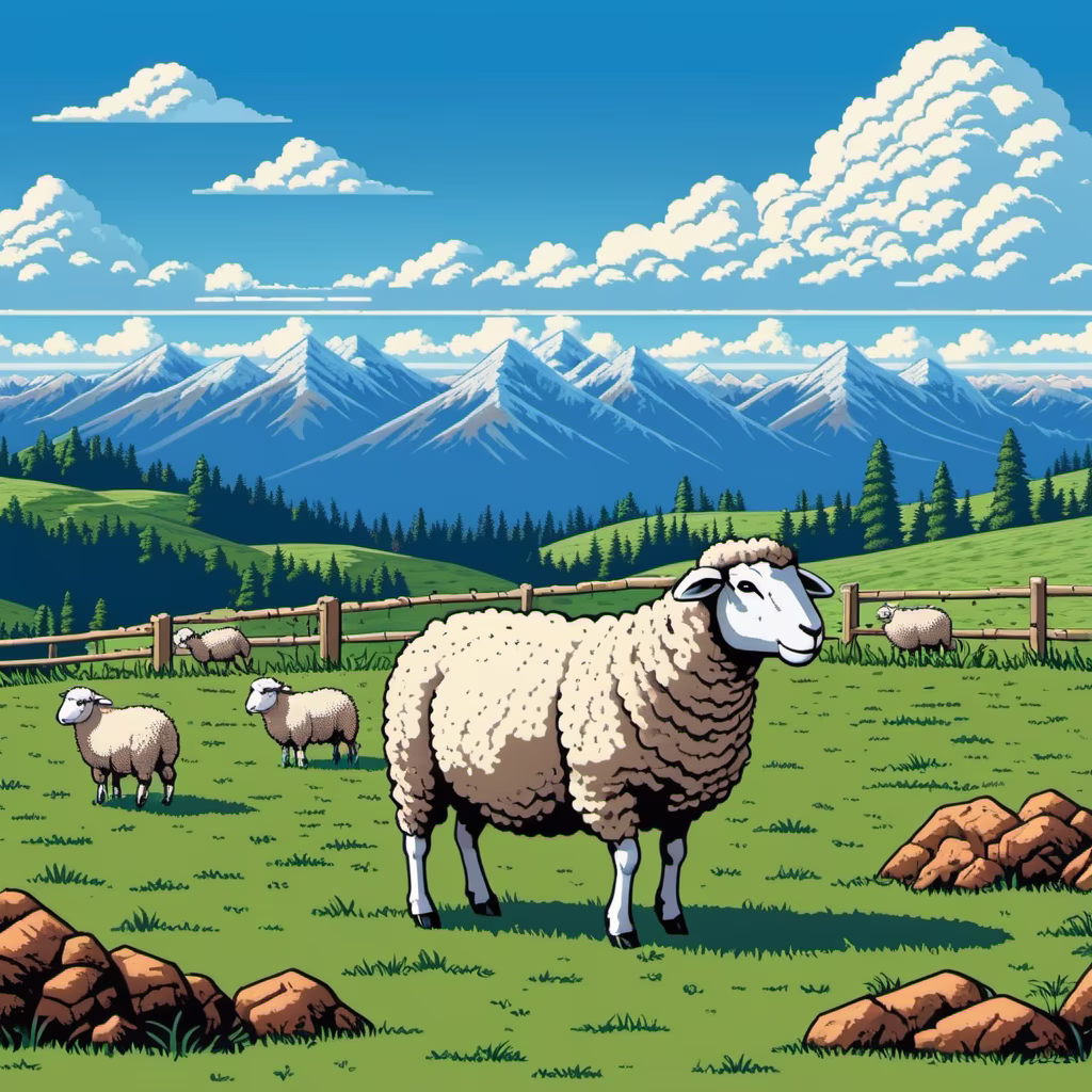 Prompt: Blue sky, white clouds, grassland, and distant mountain peaks. You can vaguely see sheep on the grassland, grazing leisurely.