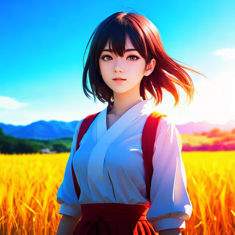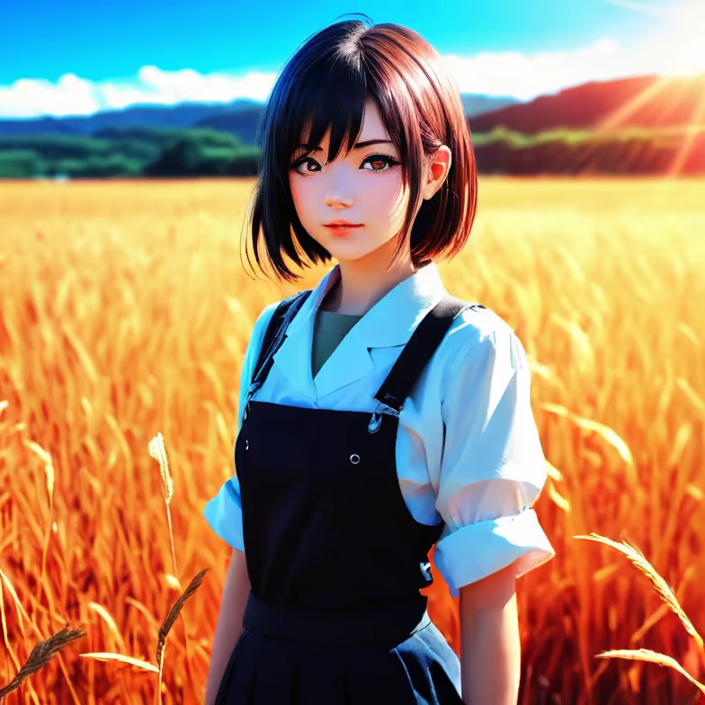 Prompt: manga style, Ultra HD, HDR, 16K, Manga girl, CG, bright, colorful, sunlight, high contrast, landscape background, field