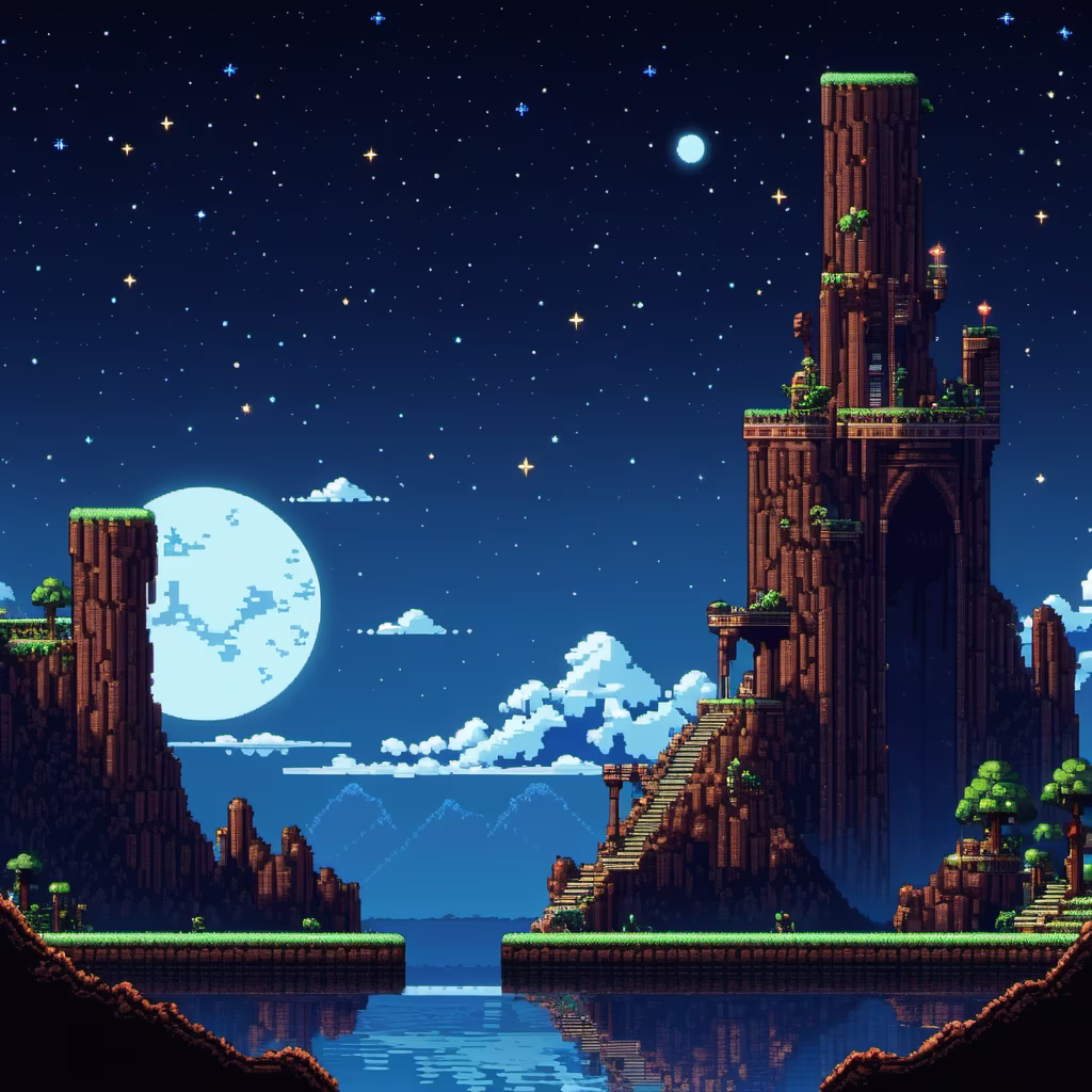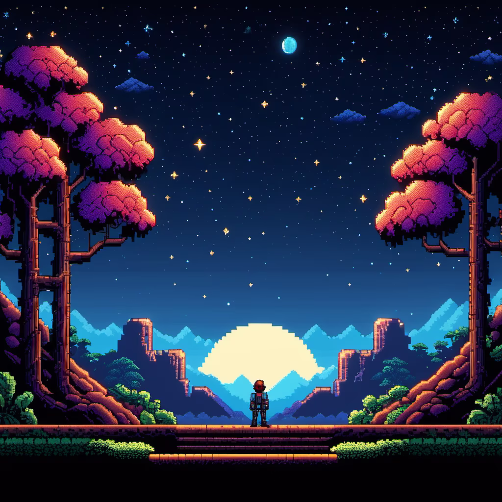 Prompt: backgtound for a 2D metroidvania game set in a visually stunning world, evening sky and stars